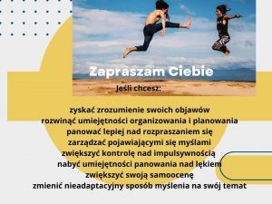 Jest to terapeutyczno-treningowa grupa oparta na autorskim programie poznawczo-behawioralnej terapii osób dorosłych z diagnozą ADHD. W programie: psychoedukacja, redukcja, modyfikacja objawów w codziennym życiu, wzajemne wsparcie oraz szukanie najlepszych sposobów zarządzania własną codziennością. Podstawowe cele terapii: zrozumienie objawów ADHD rozwinięcie umiejętności organizowania i planowania panowanie nad rozpraszaniem się zarządzanie pojawiającymi się myślami zwiększenie kontroli nad […]